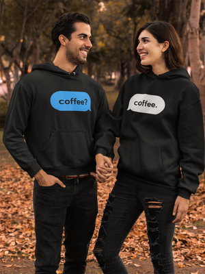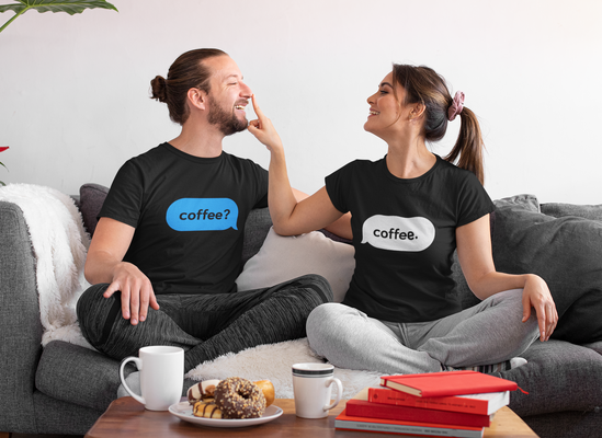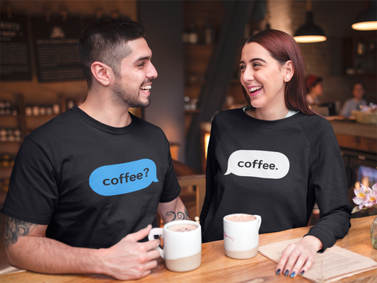Love starts with coffee โ๐ฌ This playful matching set captures the classic morning moment: โcoffee?โ โ โcoffee.โ Perfect for couples who bond over caffeine and conversations. Clean, modern, and totally relatable, this look is ideal for lazy Sundays, brunch dates, or just showing the world you two run on the same roast. A cute matching set for coffee-loving couples who vibe in sync ๐ค