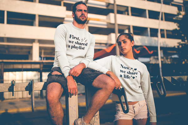 Started with music, ended with forever π΅β€οΈ. This βFirst We Shared a Playlist / Now We Share a Lifeβ matching set is for couples whose story began with a vibe and grew into something real. A heartfelt design with simple, sweet symbols β perfect as an anniversary outfit, gift for boyfriend & girlfriend, or love-themed couplewear for those who found their rhythm together π§π