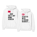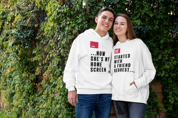 From a friend request to forever 💬❤️ — this creative matching set for couples captures the start of a modern love story. One tee says “He started with a friend request...” and the other completes it with “Now she’s my home screen.” Ideal for boyfriend & girlfriend who met online, matched on an app, or just fell in love digitally. A fun and relatable couple outfit made for love in the scroll era 📱💑.