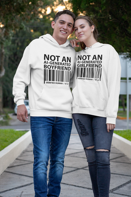 Tired of bots stealing the spotlight? Say it loud and proud: you're a verified human 🧠❤️ This playful couple matching set features barcode-style designs boldly stating “Not an AI-Generated Boyfriend” and “Not an AI-Generated Girlfriend” — perfect for digital age duos who love tech and irony 🤖✨ A quirky, photo-ready couple outfit idea and an unforgettable gift for boyfriend and girlfriend. Matching look for two that screams: real love > artificial intelligence.