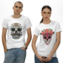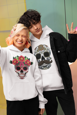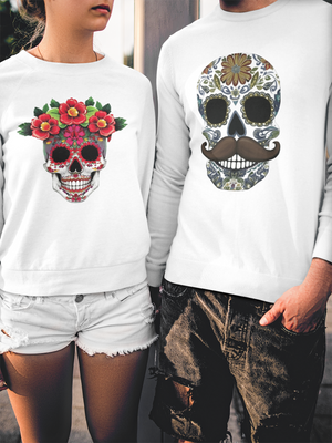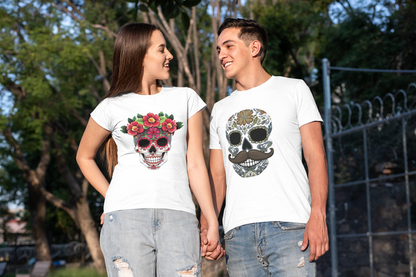βSugar Skull Loveβ is a matching set inspired by DΓa de los Muertos β symbolizing a love that transcends time and mortality. One features a floral-adorned feminine skull, the other a bold calavera with mustache flair. Perfect for couples who match in soul, not just style. A vibrant and unique couple outfit for Halloween, anniversaries, or everyday love rituals π