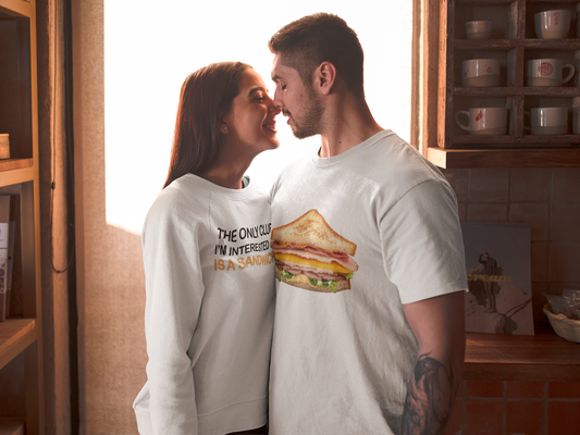 Forget the nightclubs—this couple only has eyes for club sandwiches 🥪! These matching tees are perfect for foodie duos who love carbs, laughs, and clever wordplay. One shirt says it all: “The only club I’m interested in is a sandwich,” while the other features the most epic sandwich illustration. Great for date nights, brunch, or gift ideas for food-obsessed partners! #sandwichlove #funnyfoodshirts #couplegoals