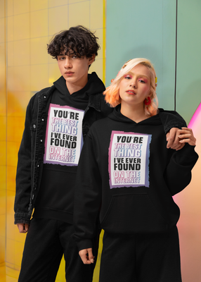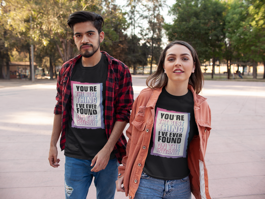 Found love in a digital place? 🖤 This “You’re the best thing I’ve ever found on the internet” design is the ultimate wink to modern romance! Perfect for couples who met online, bonded over memes, or just love a fun love note with a twist. With bold type and a pastel vibe, it’s ideal as a couple outfit idea, gift for boyfriend & girlfriend, or anniversary-ready matching look. 📱💕 Swipe right on coordinated couplewear that says it all.